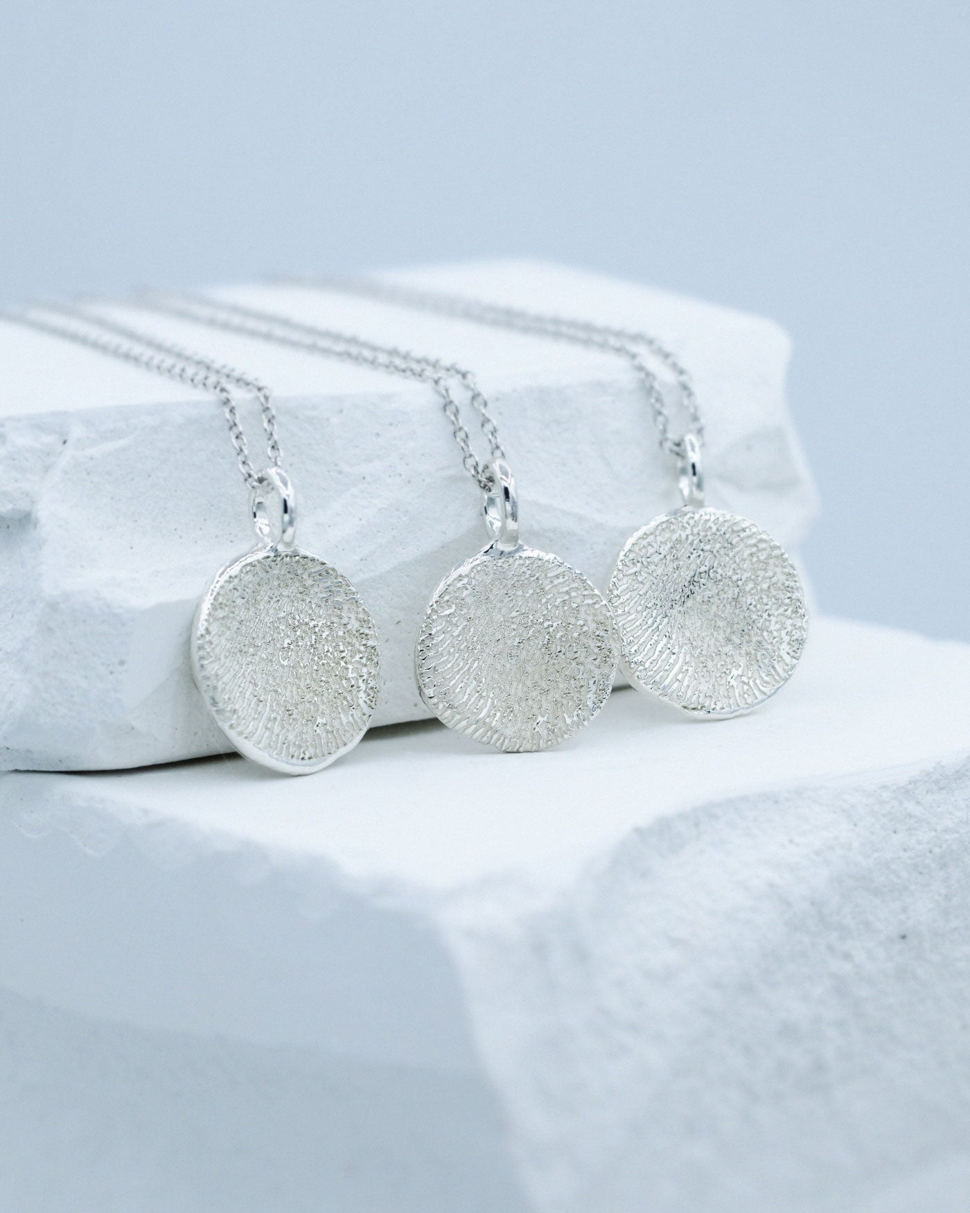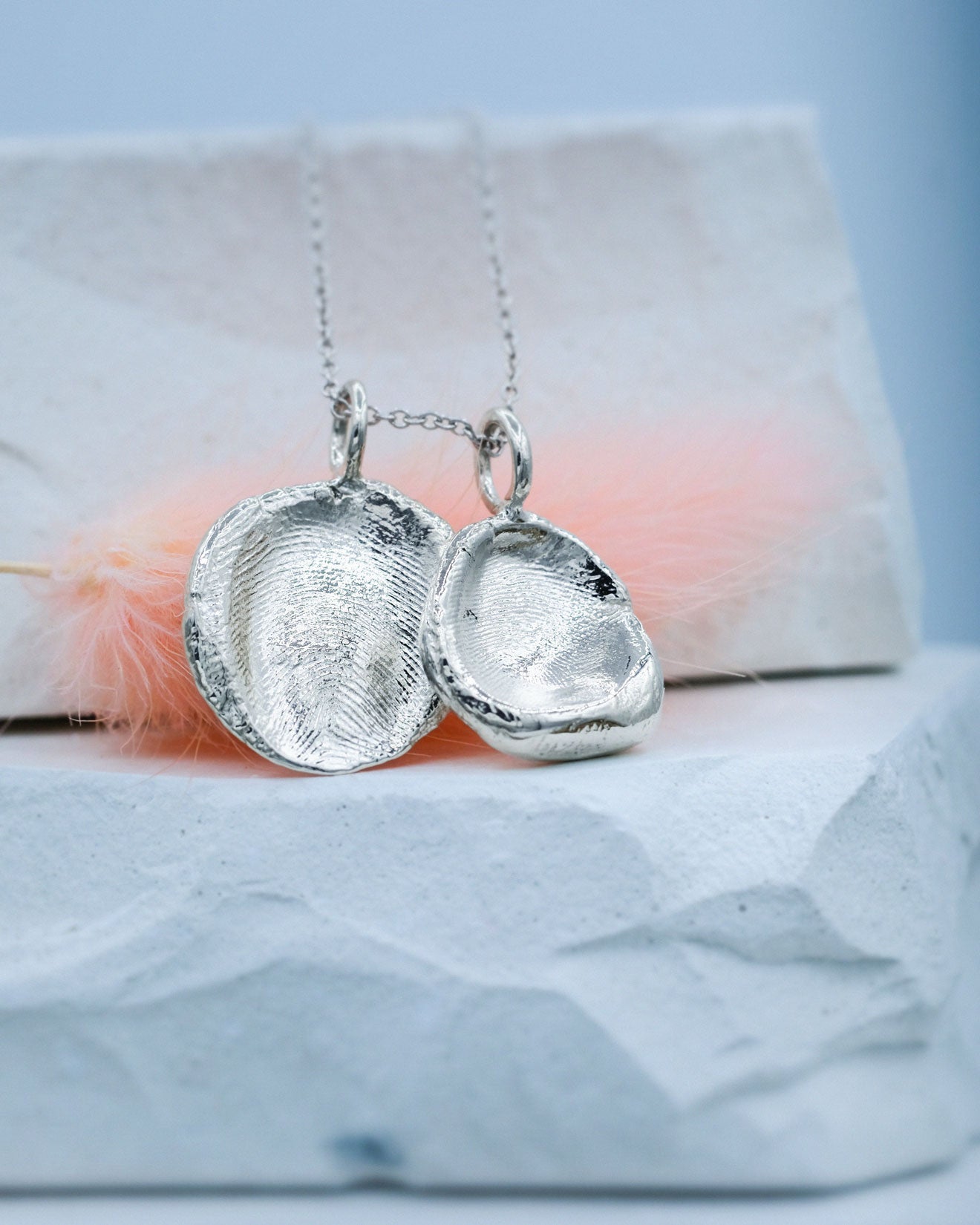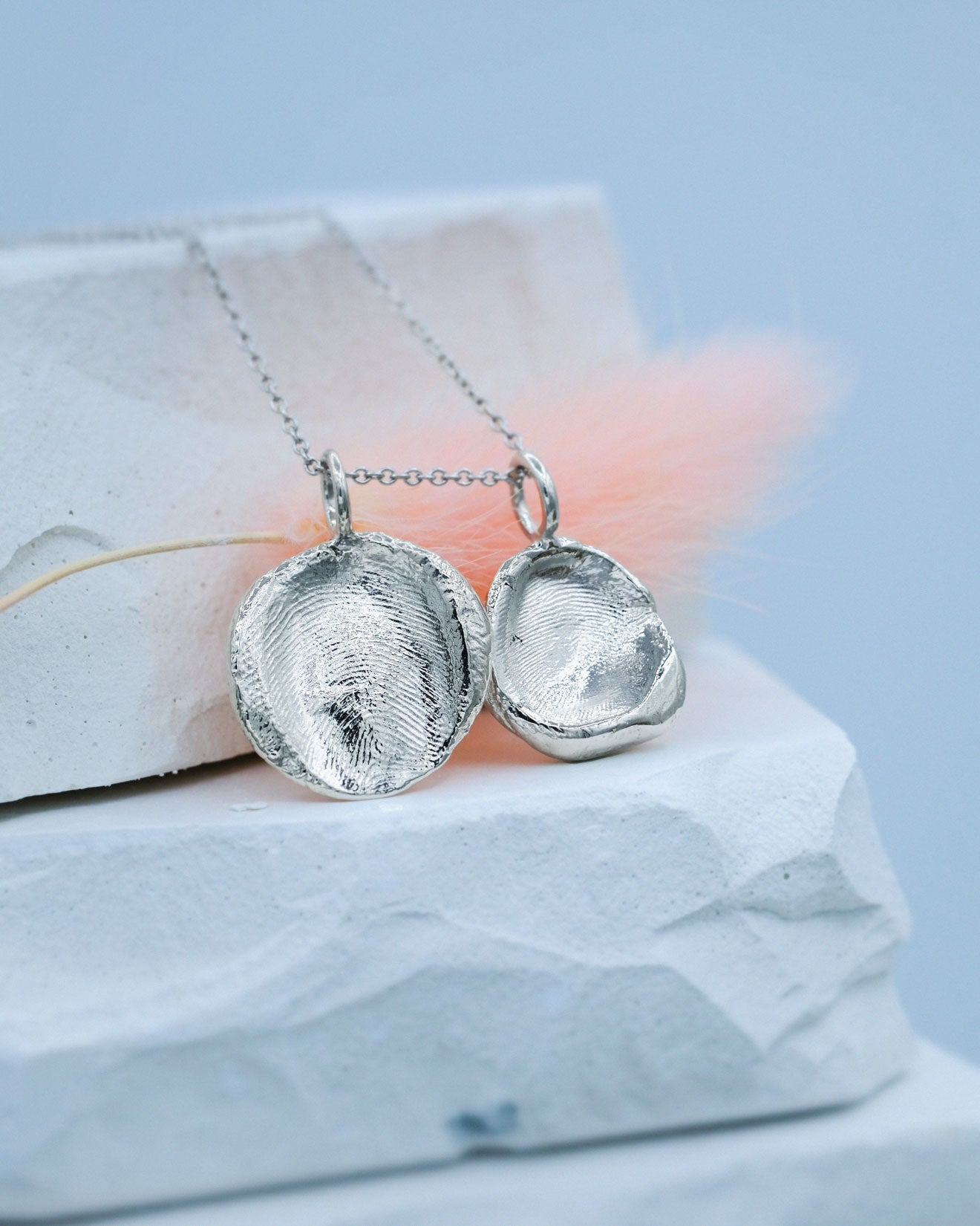 Baby & Kids Fingerprint Necklace in 925 sterling silver made using your loved ones’ actual fingerprints. Also available in solid 10k, 14k and 18k yellow, white or rose gold.
