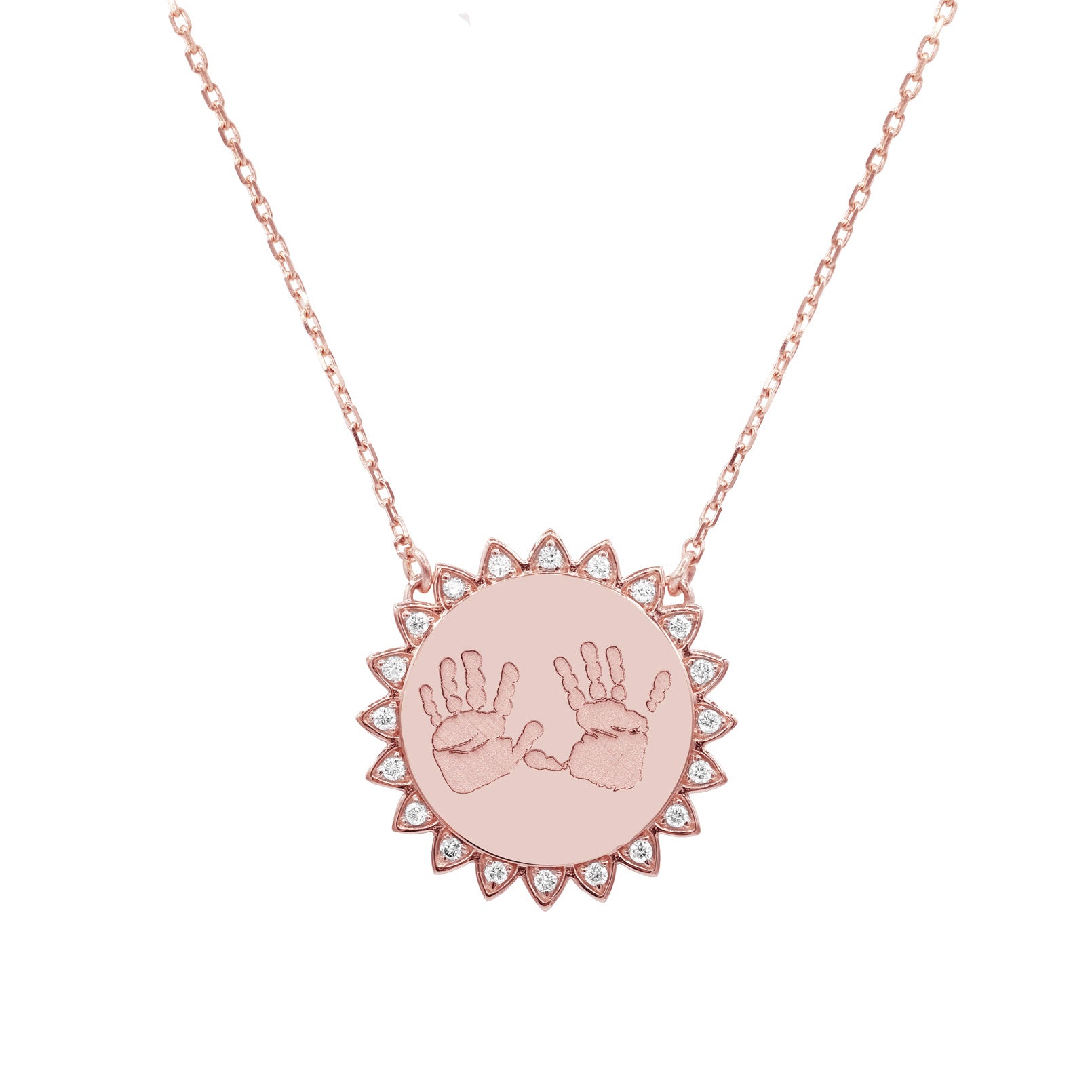 Baby Handprints / Footprints Sun Necklace with Diamonds in solid 14k yellow, white or rose gold made using your loved ones’ actual prints. Charm can accommodate up to 2 prints. Available in solid 18k gold.