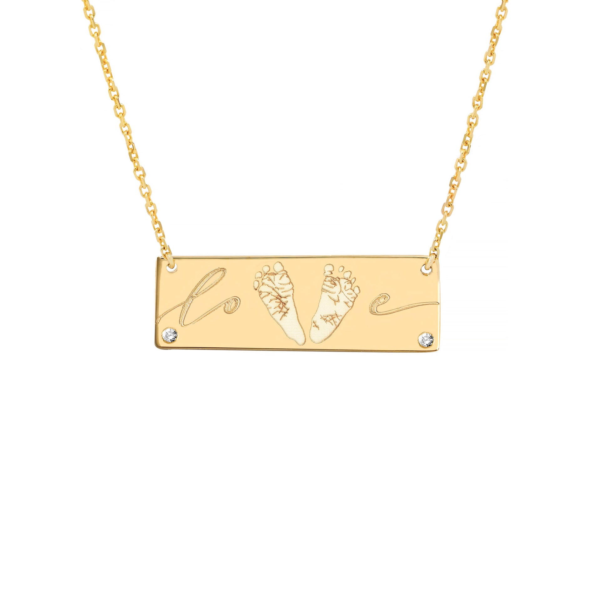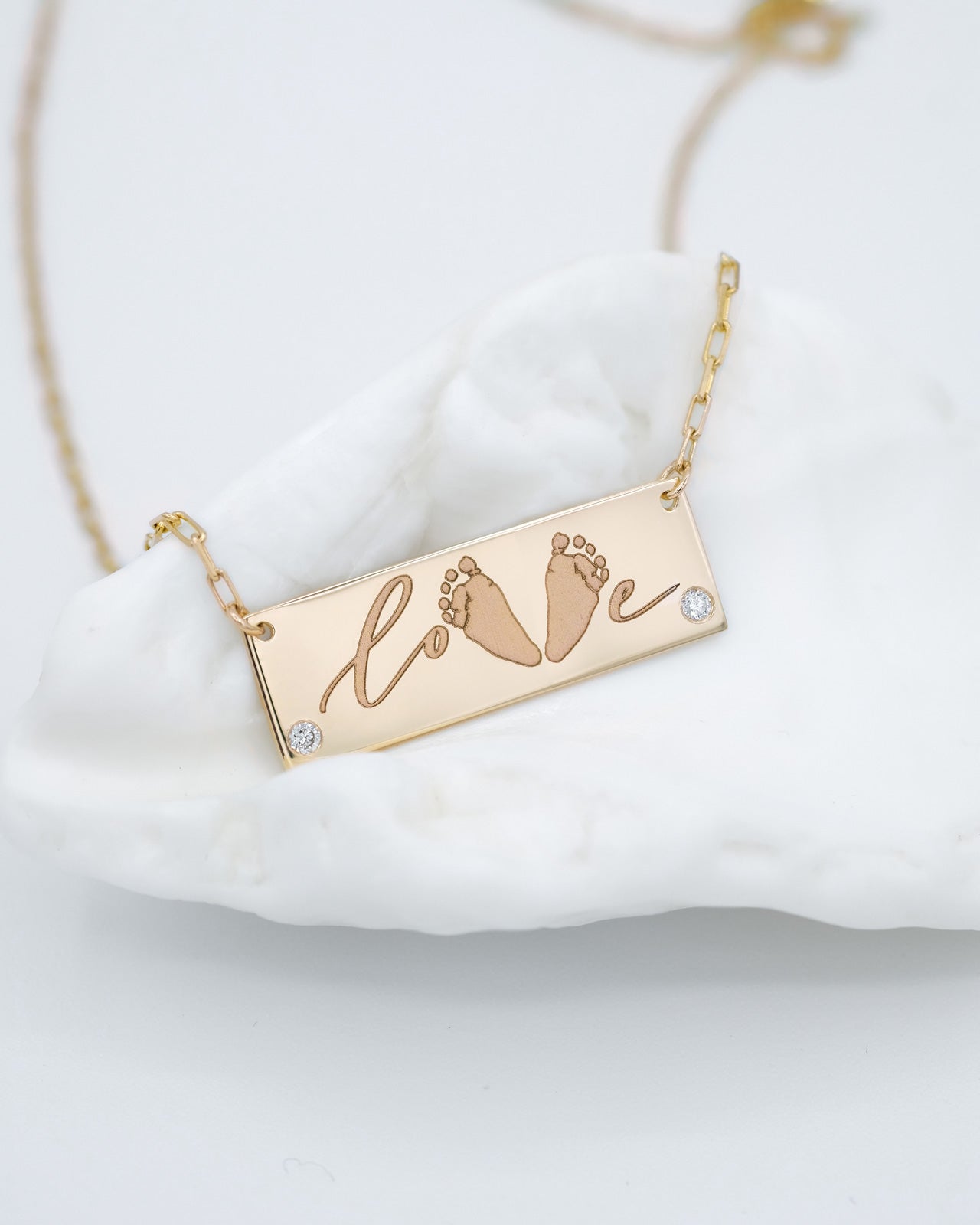 Baby & Kids Footprints LOVE Necklace in solid 14K Yellow, White or Rose Gold with 2 Diamonds made using your loved ones’ actual prints and your handwritten letters.