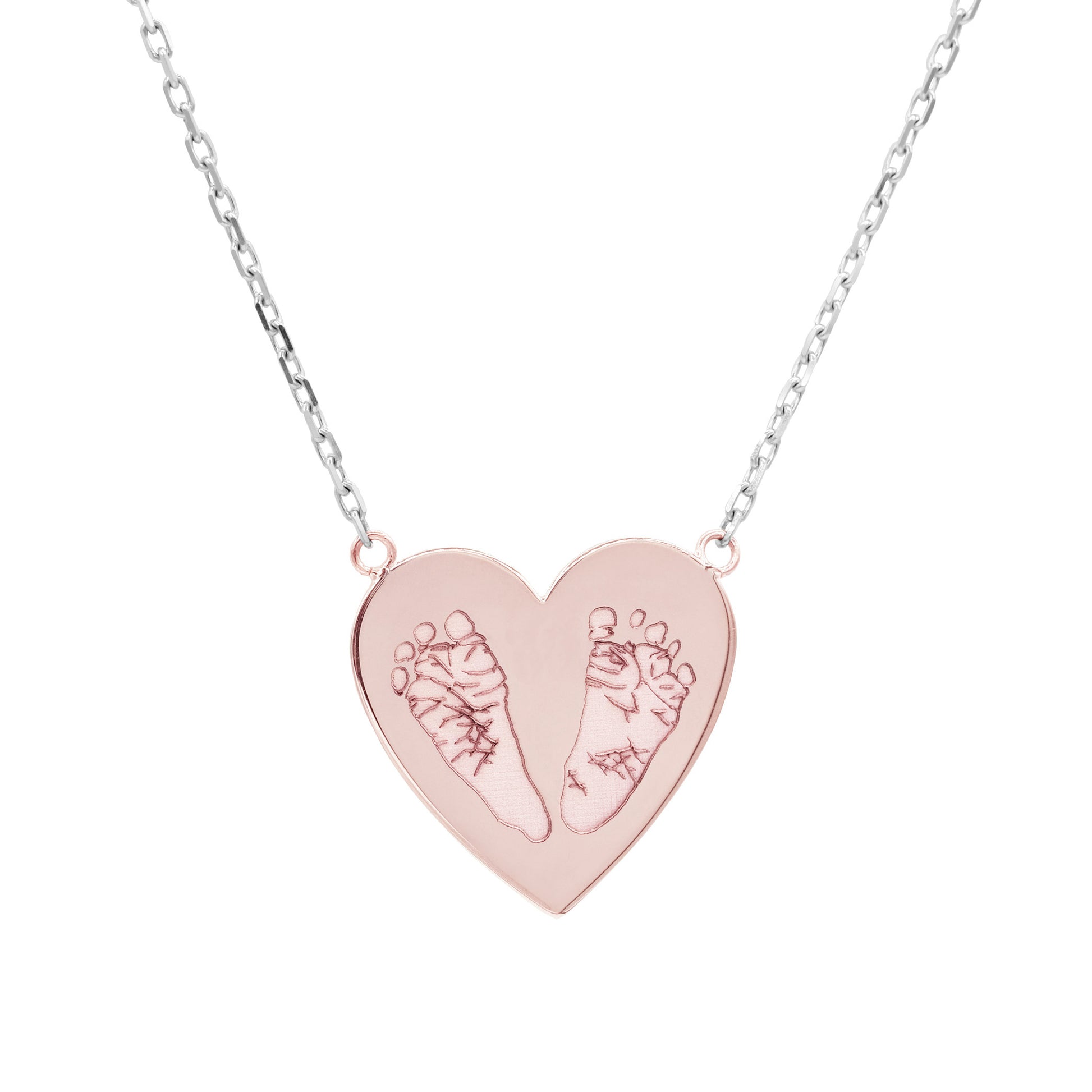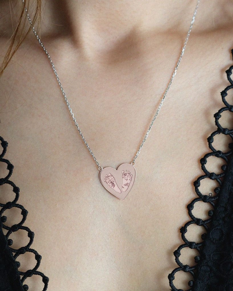 Baby & Kids Handprints / Footprints Large Heart Necklace in solid 14k gold made using your loved ones’ own prints. Heart can accommodate up to 3 prints. Available in any combination of gold (white/rose, white/yellow, all white, all yellow and all rose gold).